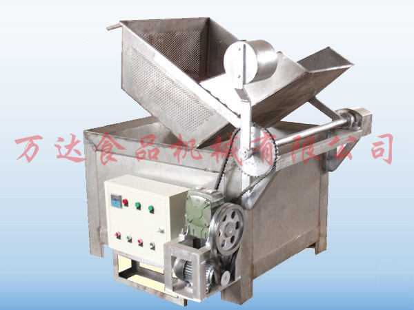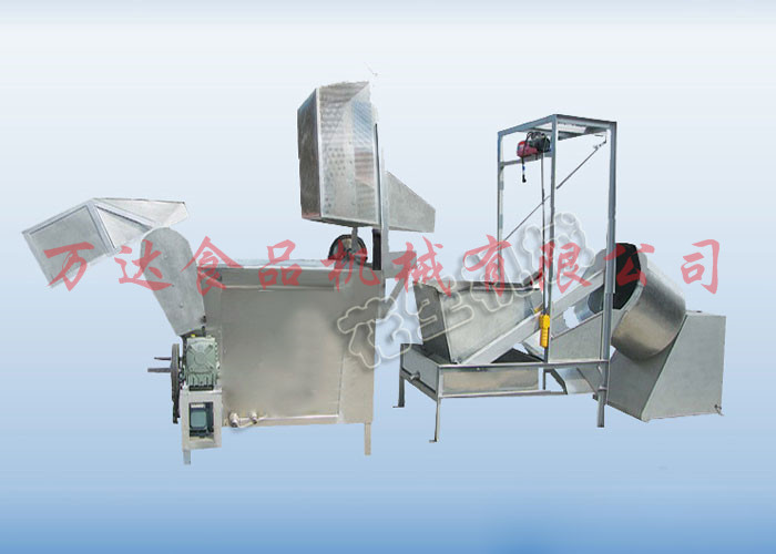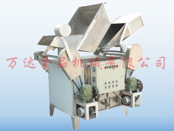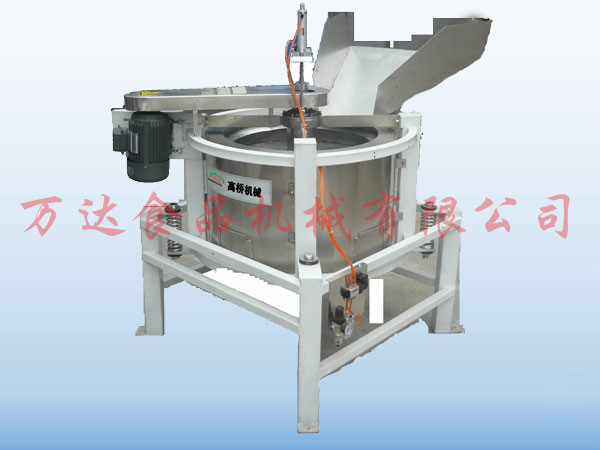 全自動(dòng)脫油機(jī)的基本工作原理是利用脫油筒高速轉(zhuǎn)動(dòng)產(chǎn)生的離心力的作用將粘附在花生米表面的附油脫離出去,脫離下來的油通過機(jī)架上的出油管流到機(jī)體外的收集桶中。脫油后的花生米通過氣缸控制脫油籠中閥的提升,從落料口通過滑落到冷卻輸送帶(或料斗)中,然后進(jìn)行下一步工序處理。