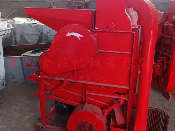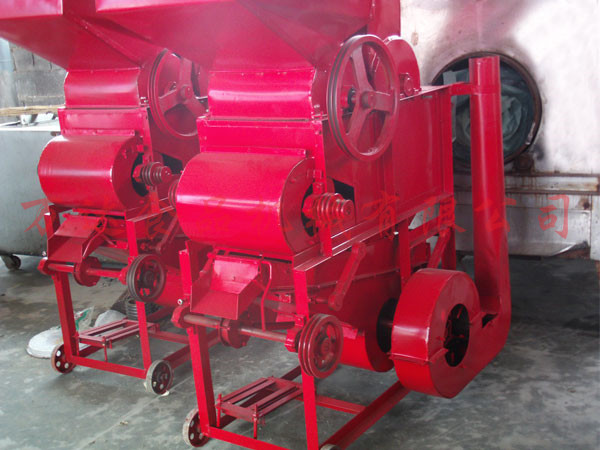 結構及工作原理:本機采用紋纖、柵條、凹板、風機、比重分選篩及二次提升機等幾部分組成,結構簡單緊湊、性能穩定、安全可靠。工作原理:花生果由人工喂料,先落到粗紋柵里,由于紋板轉動與固定柵條凹板間的搓力,將花生殼剝離,分離后的花生仁與殼同時經過柵網落下,再經過風道由風力將大部分花生殼吹出機外,而花生仁和一部分尚未剝離的花生小果一起落入比重分選篩進行精選,經過重篩選后,花生仁由分離篩面上行,通過料口流入麻袋,而尚未剝開的花生小果,則由篩面下行,經過出料道口流入提升機。再由提升機送入細紋柵進行二次剝殼,再經過比重分行篩分選,既可達到全部剝殼。